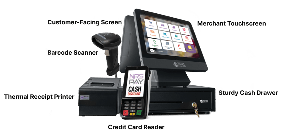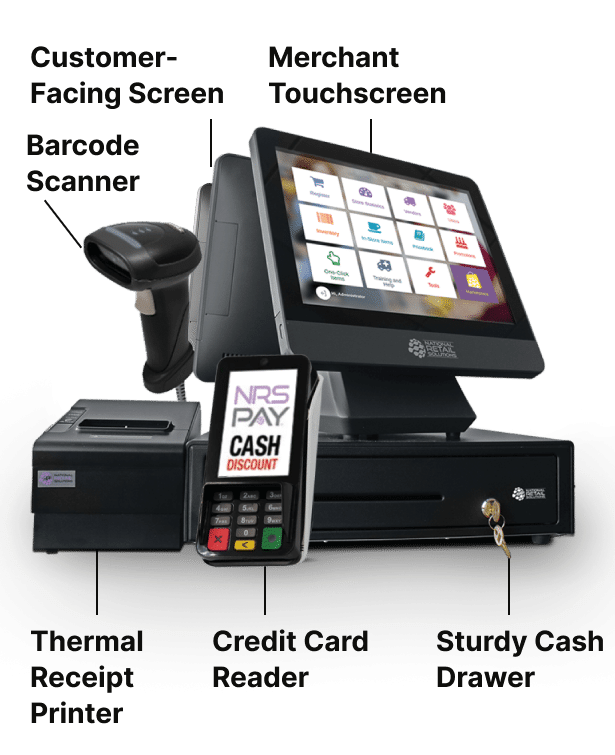 The NRS PAY POS is more than just a hardy machine that’s built to last. Its sleek design boasts a large merchant touchscreen interface and customer-facing transaction screen, thermal receipt printer, barcode/ID scanner, and sturdy metal cash drawer. Plus, of course, with NRS Pay Cash Discount signup, you get a FREE, integrated, PCI-compliant credit card reader.